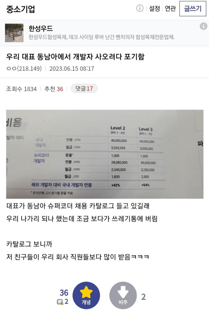 자기 직원들보다 동남아 개발자들이 월급 더 많이 받음