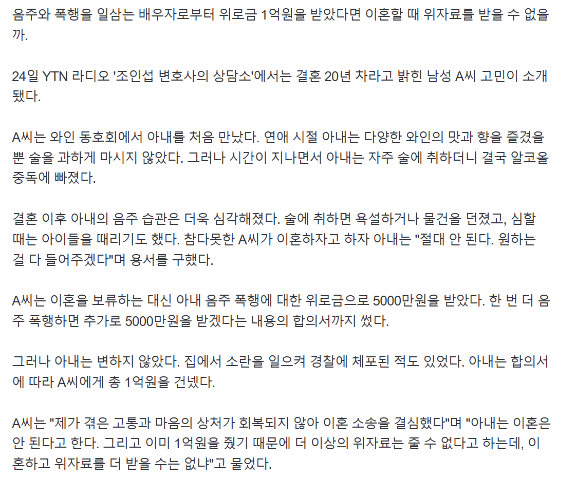 맞고 사는 남편 "아내가 1억 위로금 줘"…이혼하면 위자료는 따로?