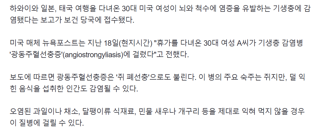 해외여행 다녀온 여성, 뇌에 기생충 감염…"이것 먹으면 걸려"