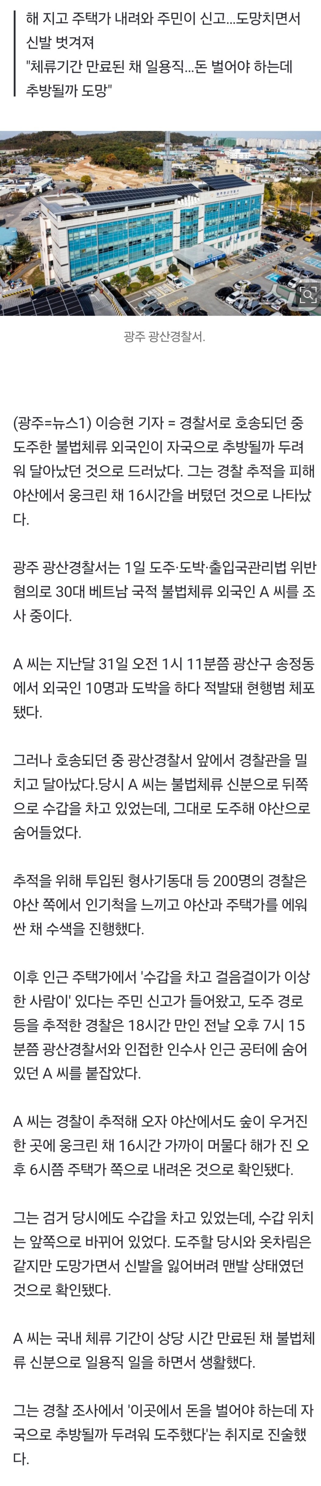 도주 18시간 만에 붙잡힌 외국인, 야산서 16시간 웅크리고 버텨