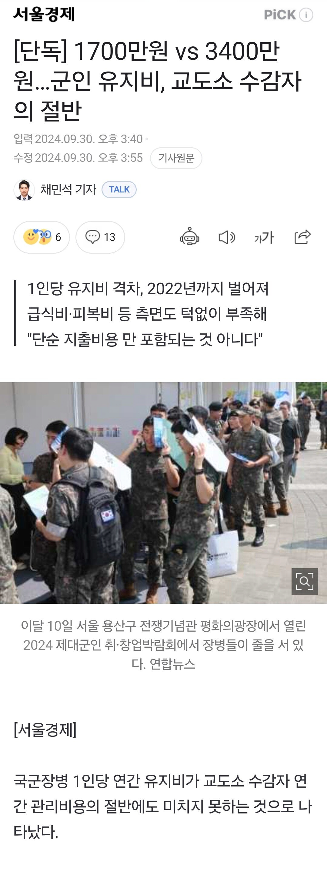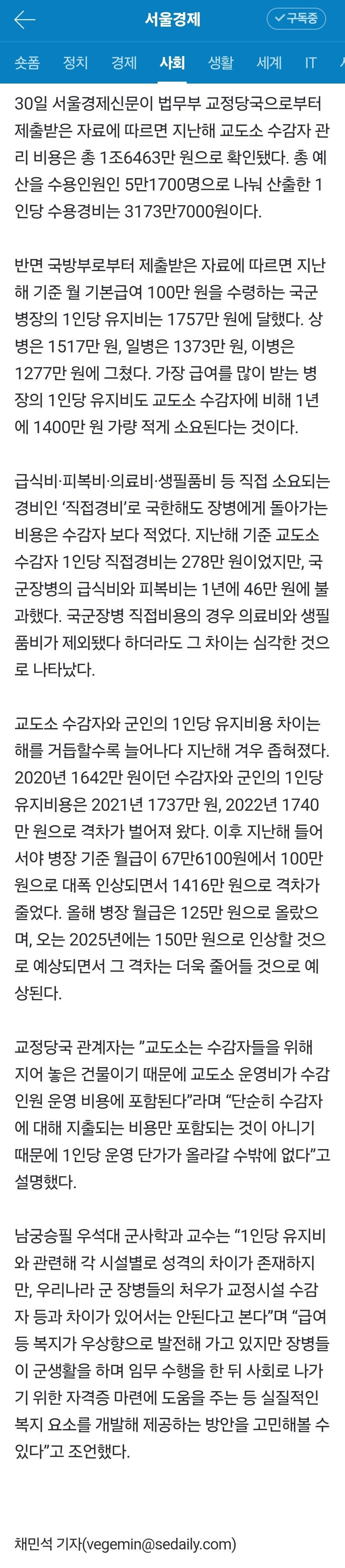 군인 유지비 1,700만 원 vs 수감자 유지비 3,400만 원,