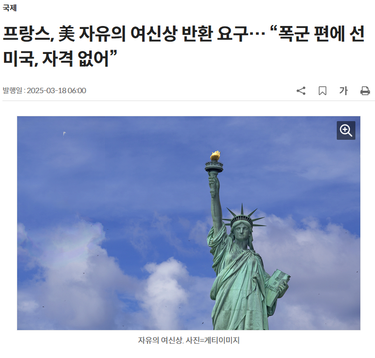 프랑스 "미국, 자유의 여신상 돌려줘" vs 미국 "우리 아니였으면 니네 독일어 썼음 ㅅㄱ"