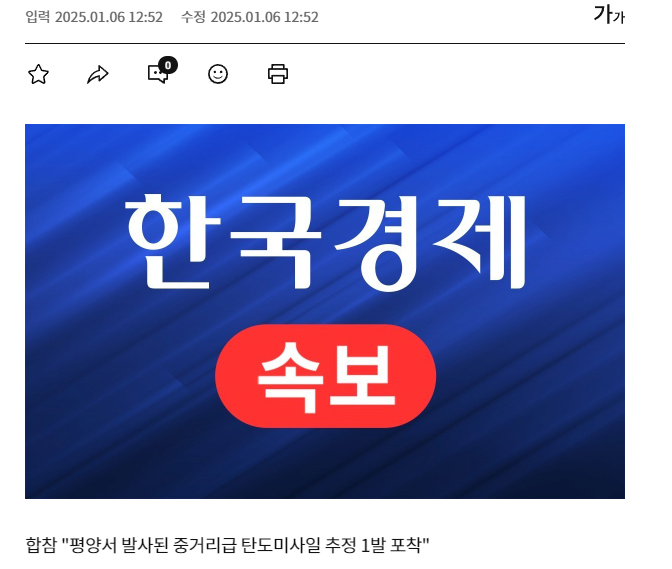 [속보] 합참 "평양서 발사된 중거리급 탄도미사일 추정 1발 포착"