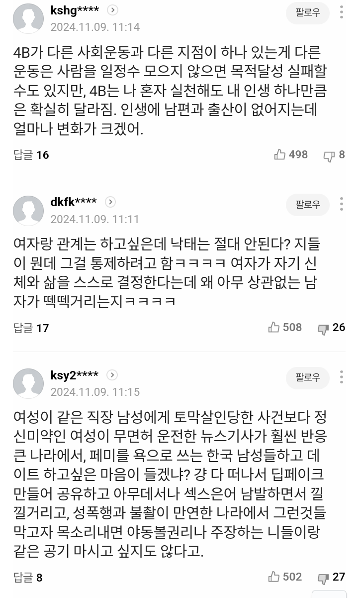 조지아주에 거주하는 미셸라 토마스(21)는 4B 운동이 “원인에는 결과가 따른다는 것을 보여준다”고 WP에 밝혔다. 토마스는 “젊은 남자들은 섹스를 기대하면서도 우리(여성들)가 임신중지를 하지 못하길 바란다. 그들은 둘 다 가질 순 없다”며 “젊은 여성들은 여성의 권리를 위해 싸우지 않는 남성과 친밀하게 지내고 싶어하지 않는다. 그들(남성들)이 우리를 존중하지 않는다는 의미이기 때문”이라고 강조했다.