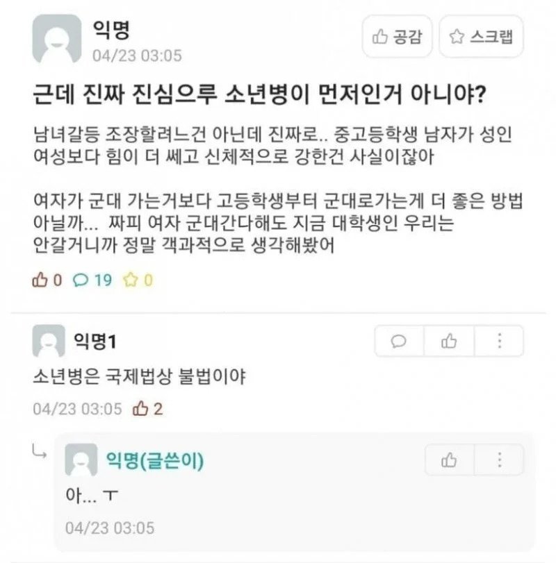 여성징병 보다는 소년병 징집이 먼저 아니야?