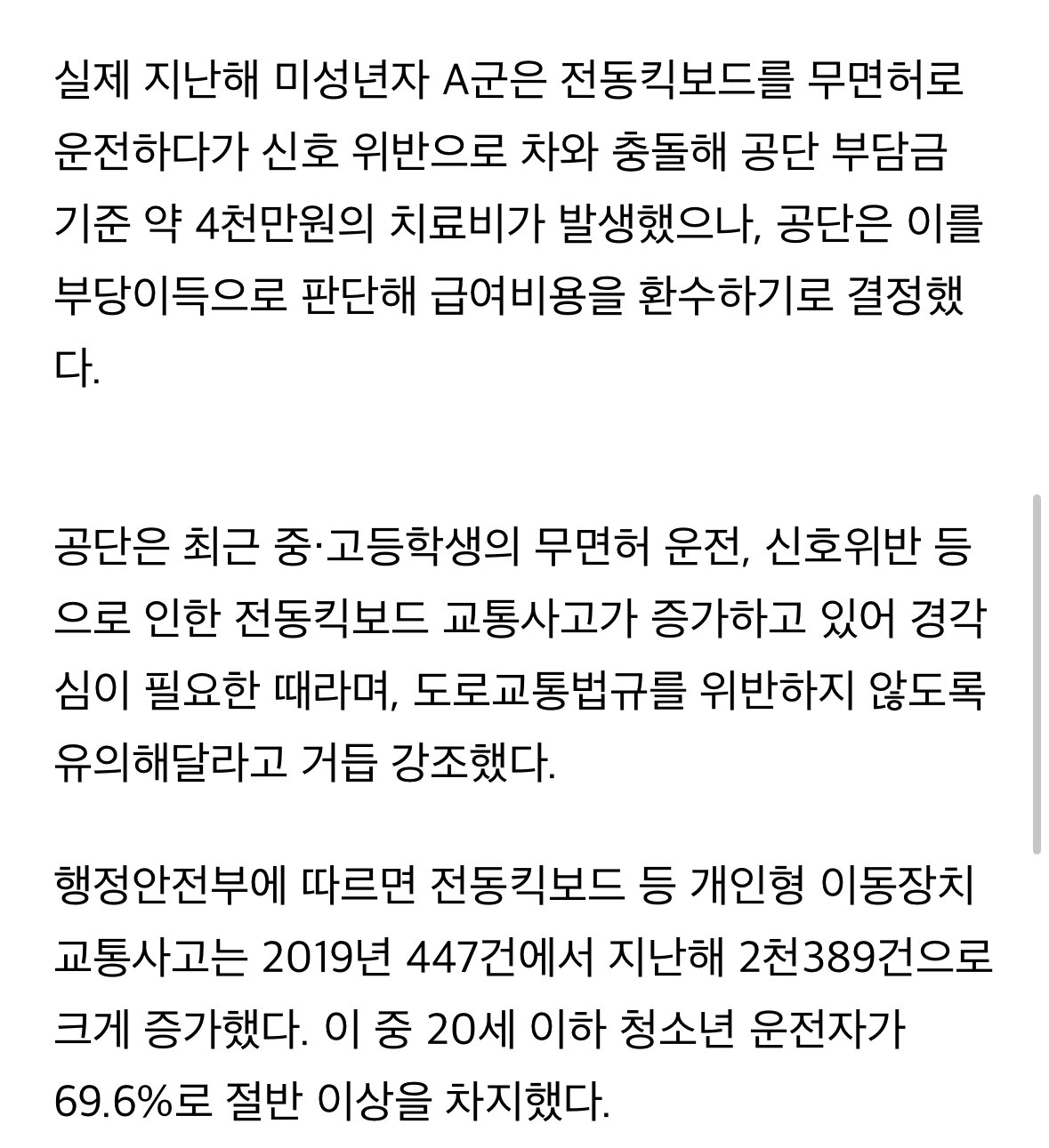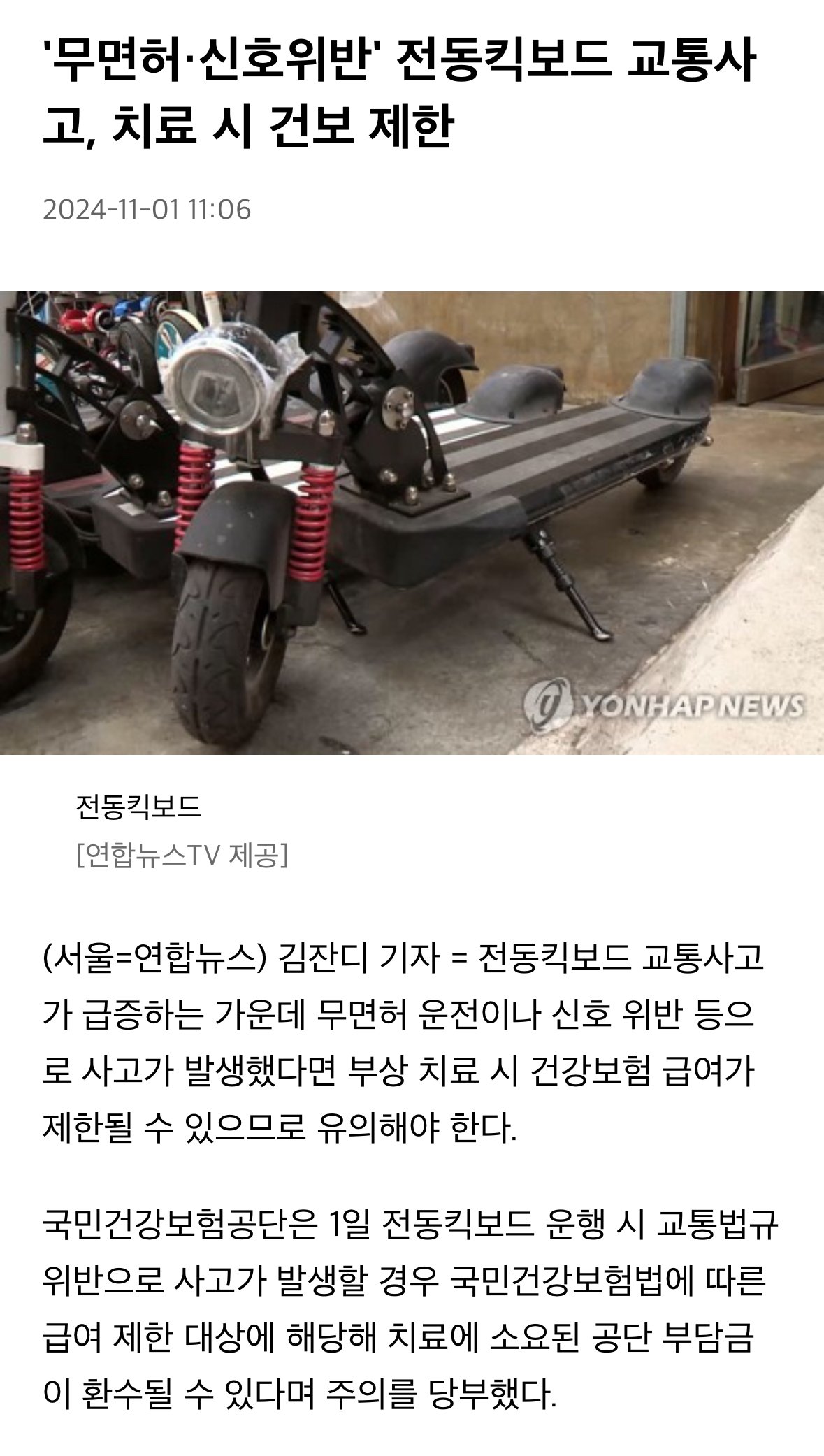 무면허 전동킥보드 사고난 미성년자, ‘건보 적용불가’치료비 4천만원 환수