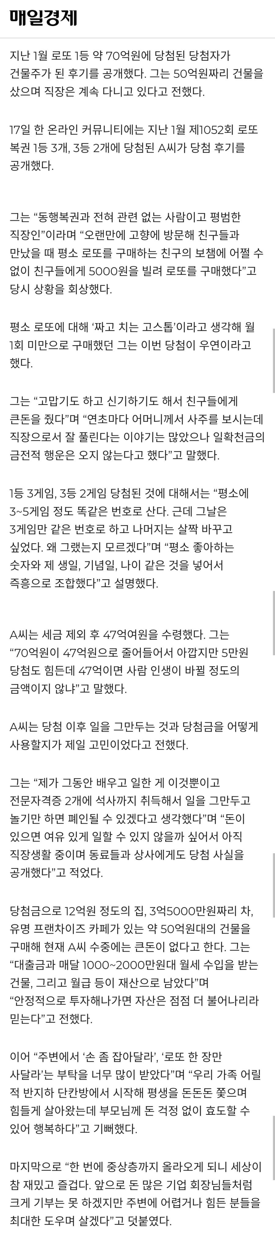 로또 70억 ( 세후 47 억 ) ’ 당첨자의 K 직장인 인증...“회사 계속 다닐래요” .JPG