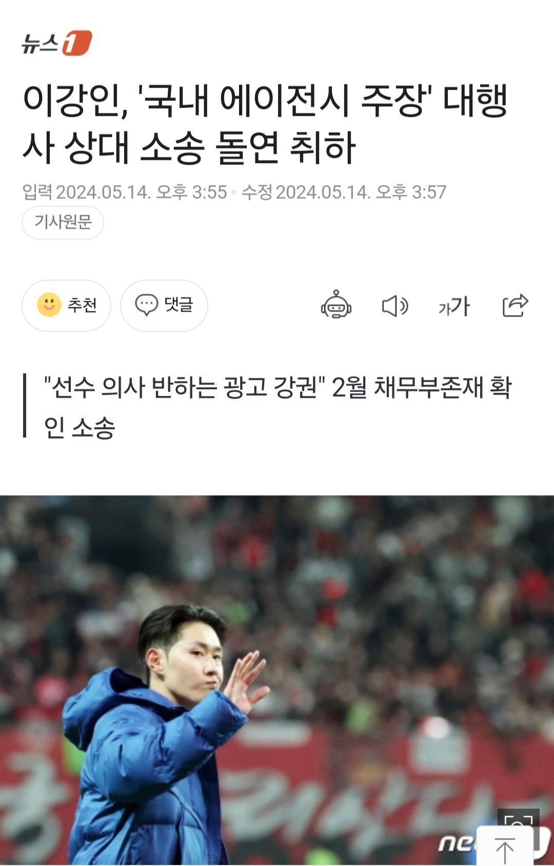 14일 법조계에 따르면 이강인 측은 전날 A 사를 상대로 낸 채무부존재확인 소송을 심리 중인 서울중앙지법 민사31단독 조형우 판사에게 소취하서를 제출했다.