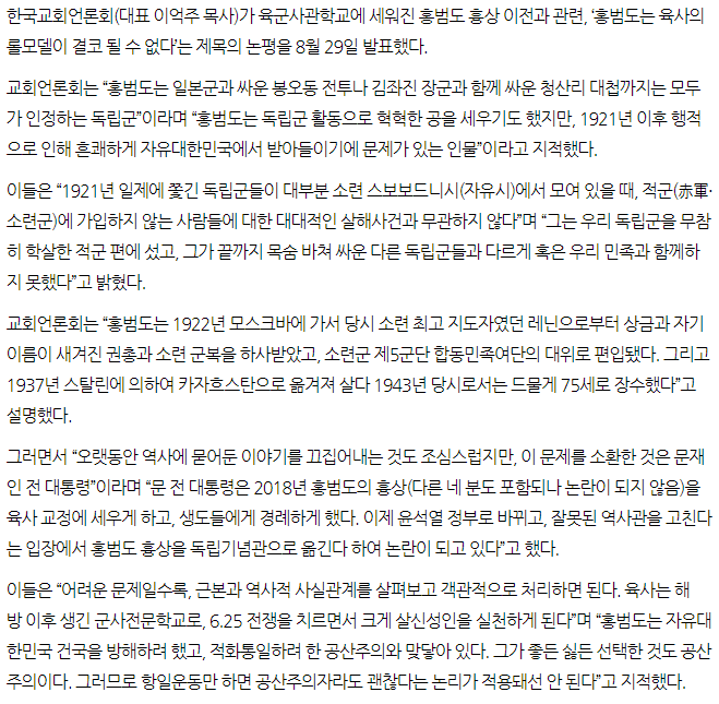 기독교가 이야기하는 홍범도 동상 철거해야하는 이유