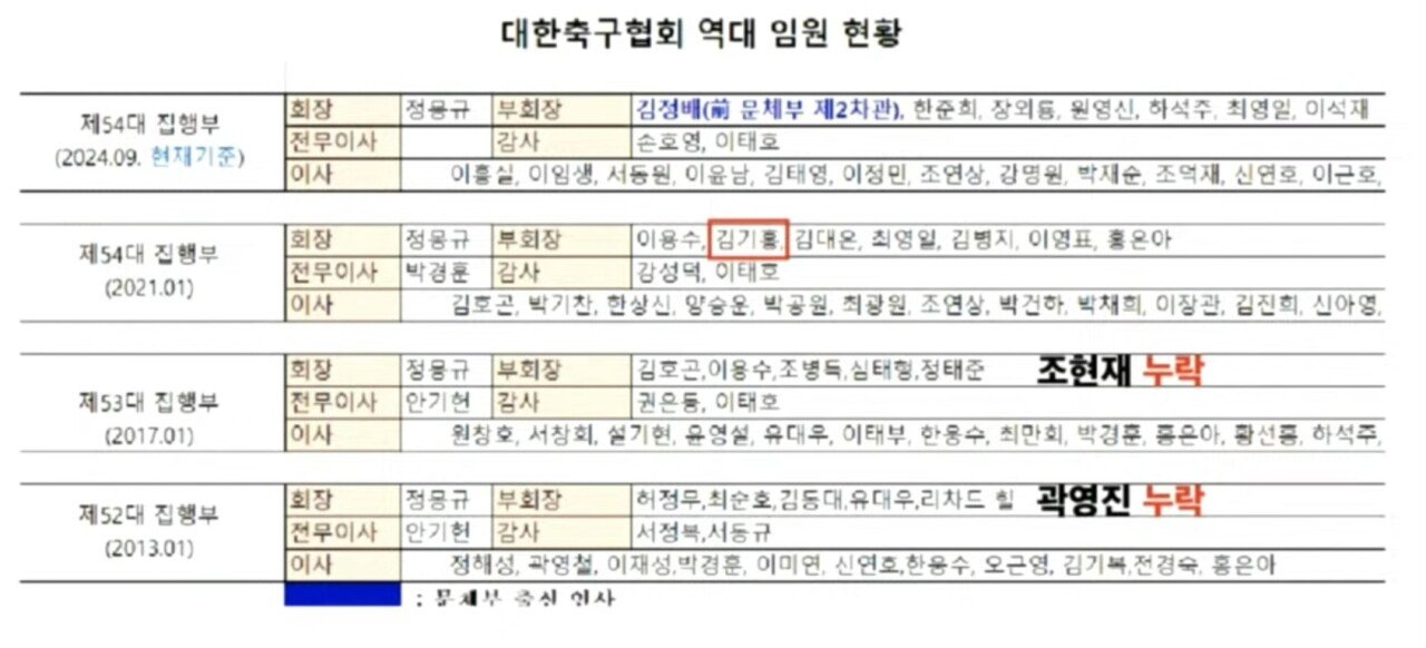 축협의 집행부 명단과 문체부 출신 인사들을 표시해달라 요청했으나