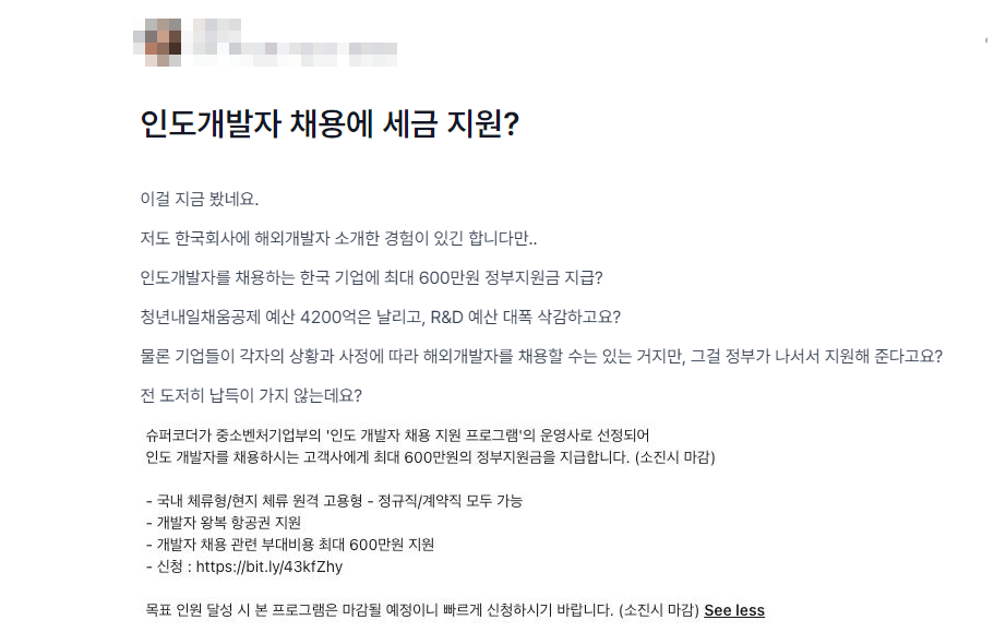 인도개발자 채용에 세금 600만원 지원 ㅋㅋ