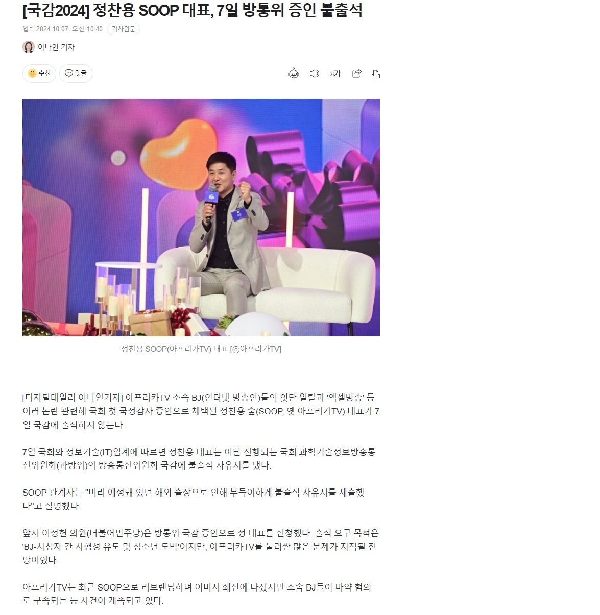 [국감2024] 정찬용 SOOP 대표, 7일 방통위 증인 불출석