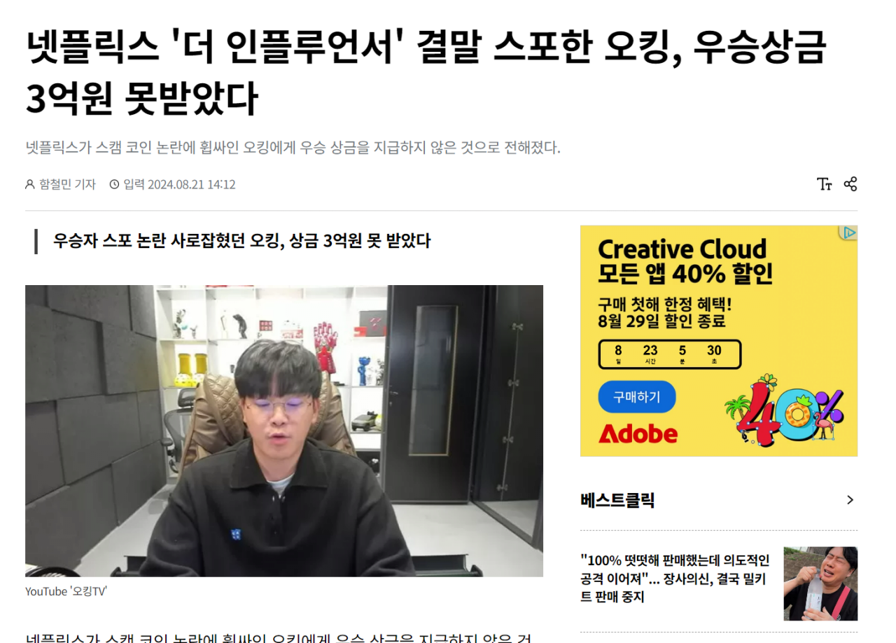 넷플릭스 '더 인플루언서' 결말 스포한 오킹, 우승상금 3억원 못받았다