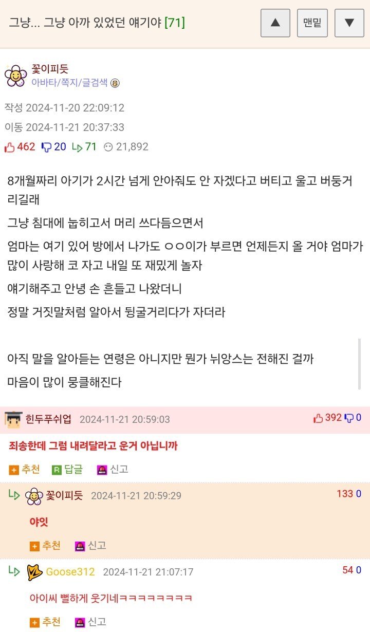 2시간 넘게 울던 8개월 아기를 겨우 재운 엄마에게