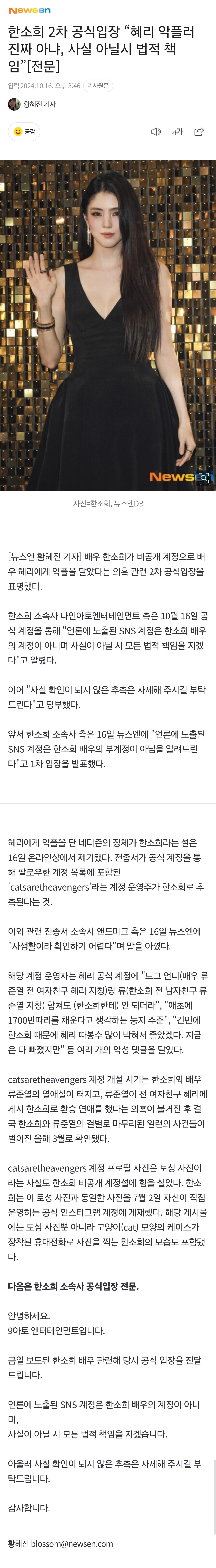 한소희 2차 공식입장 “혜리 악플러 진짜 아냐, 사실 아닐시 법적 책임”[전문]