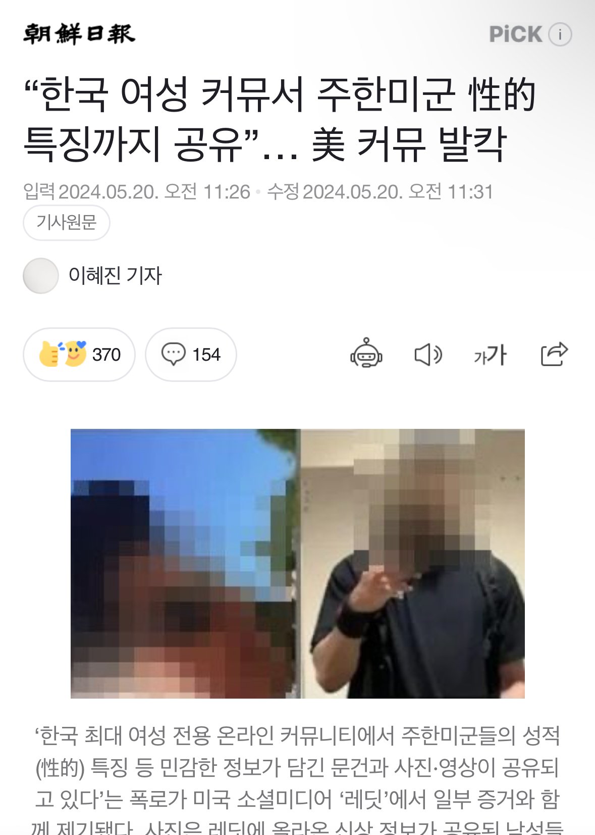 [조선] “한국 여성 커뮤서 주한미군 性的(성기) 특징까지 공유”... 美 커뮤 발칵