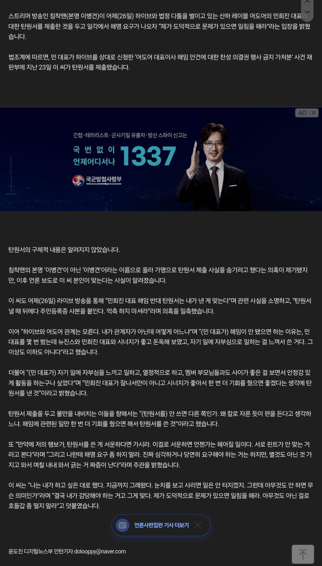 침착맨 "'민희진 해임 반대' 탄원서 내가 냈다...이유는"