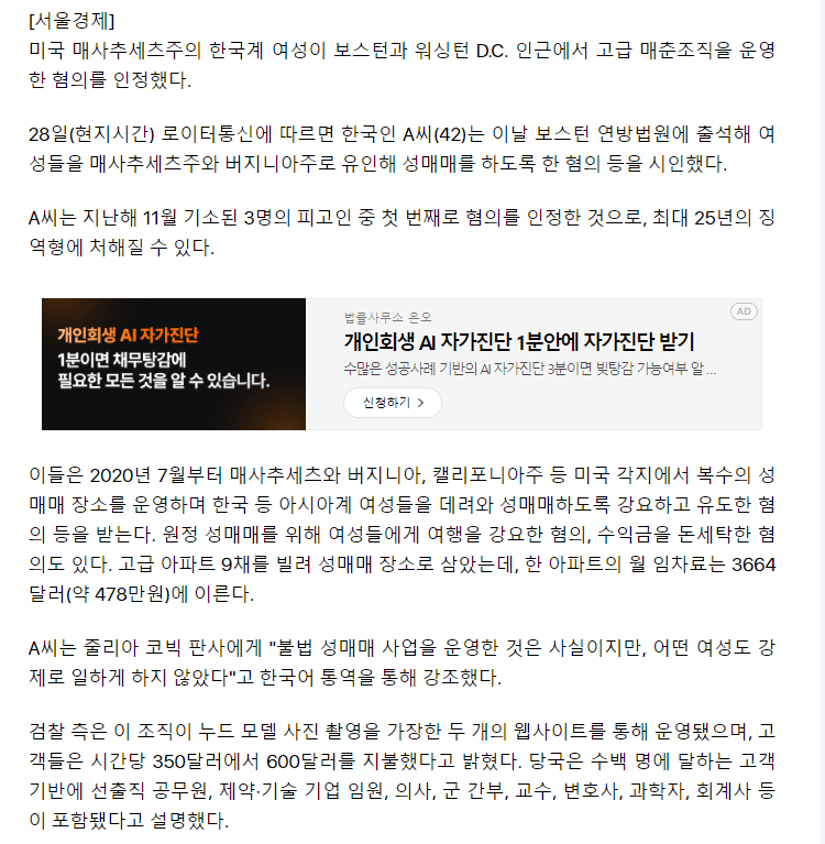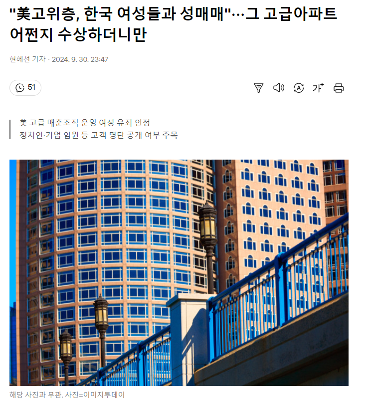 한국 여성들 미국 고위층과 고급아파트에서 성매매