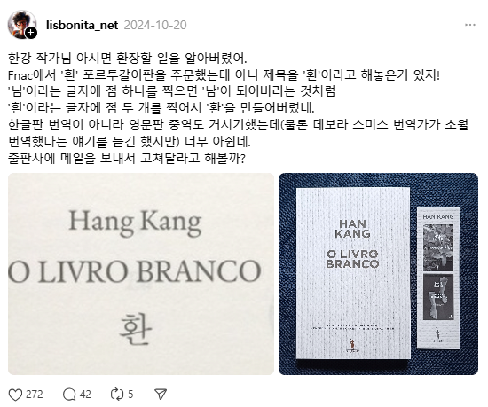 한강 작가의 소설집 '흰'이 포르투갈에서 번역 출간되면서 표지를 '환'으로 오타를 내버림.