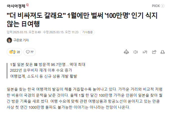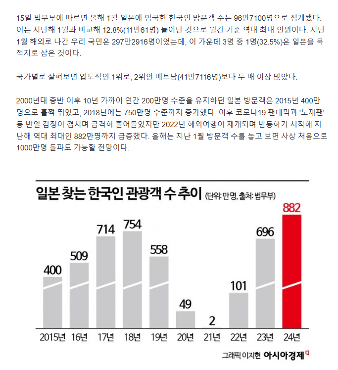 한국인 일본관광 한달에 100만명... 연간 1000만명 돌파할까? ㅎㄷㄷ