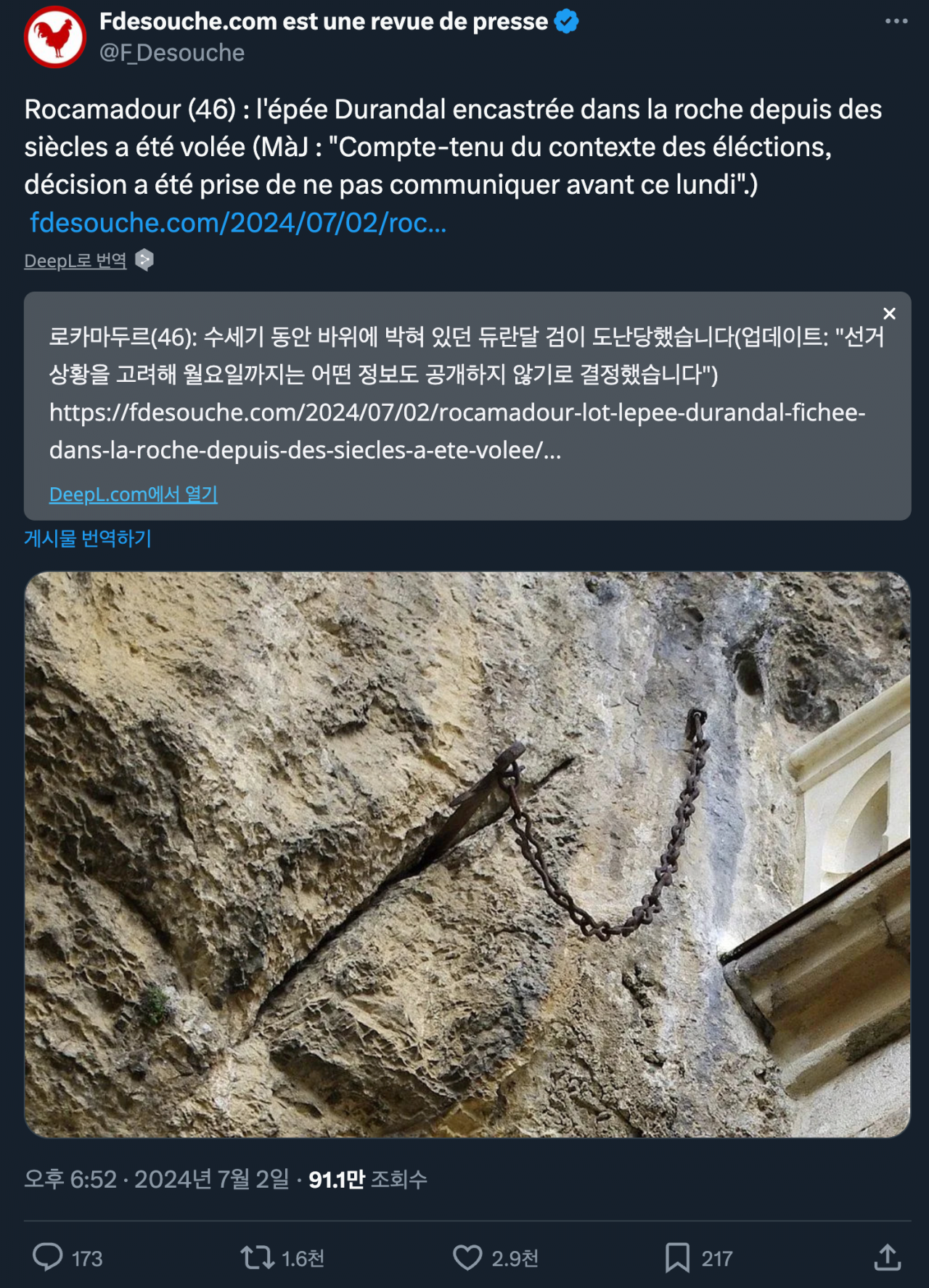 롤랑의 성검 듀랑달, 도난당한 것으로 밝혀져