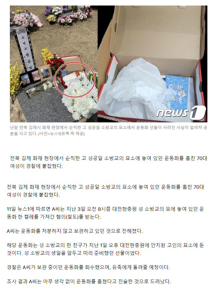 "아무 생각 없이…" 순직 소방관 묘소서 운동화 훔친 70대 女