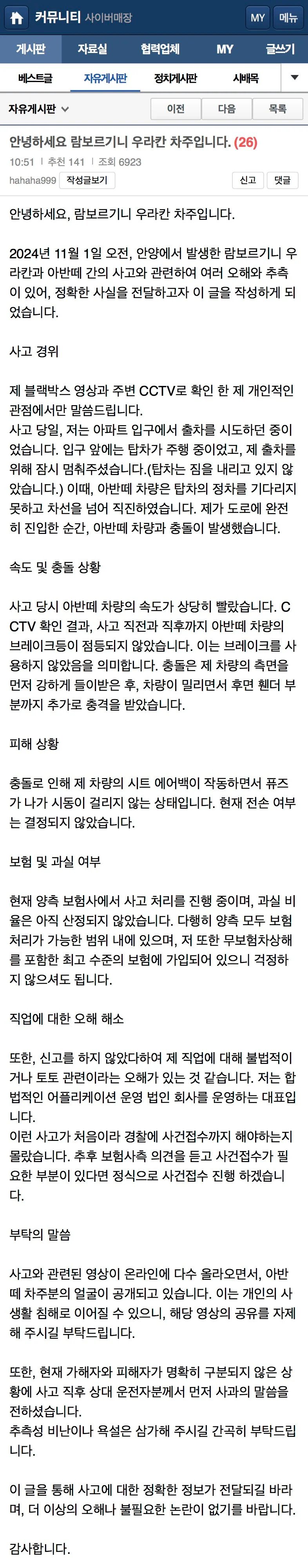 보배에 올라온 람보르기니 우라칸 차주 글