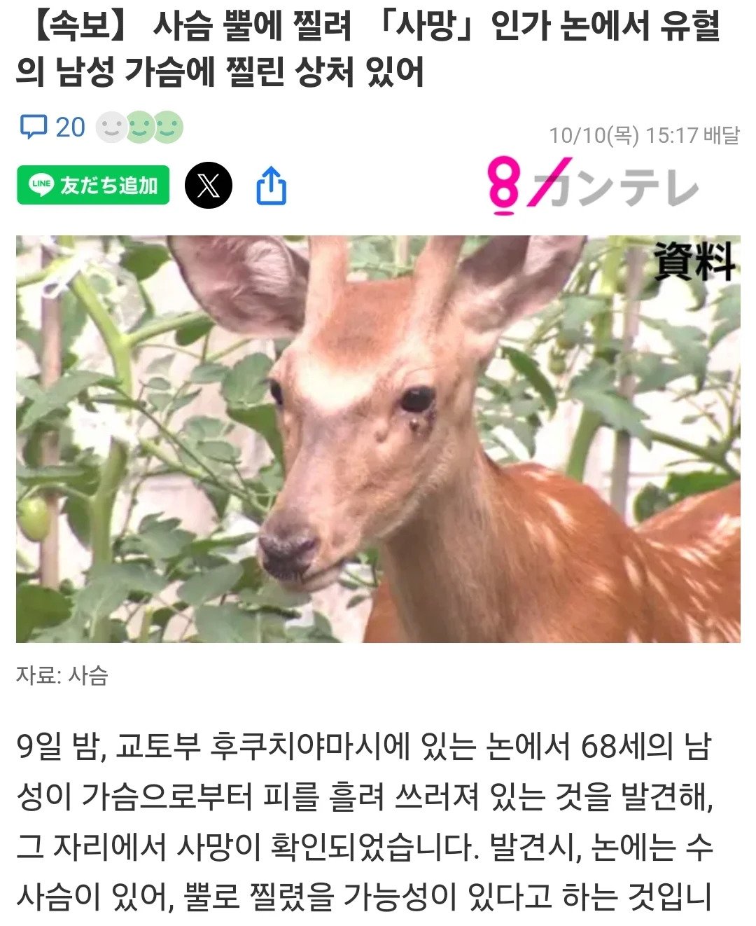 일본 논에서 남성 사슴뿔에 찔려 사망 추정
