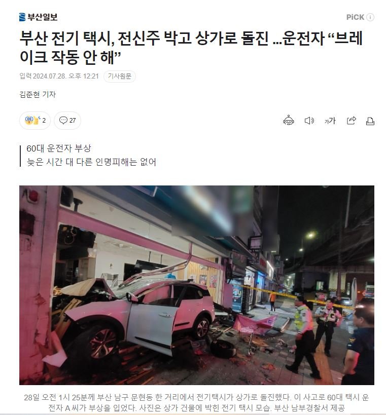 부산 전기 택시, 전신주 박고 상가로 돌진 ...운전자 “브레이크 작동 안 해”