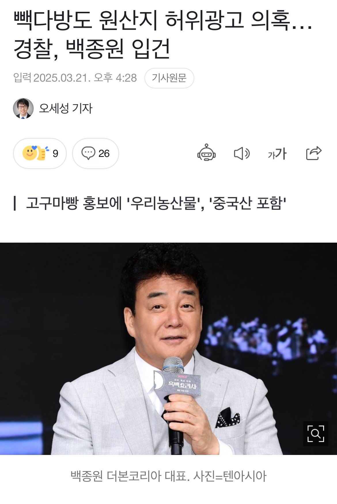 빽다방도 원산지 허위광고 의혹…경찰, 백종원 입건 ㅎㄷㄷㄷ