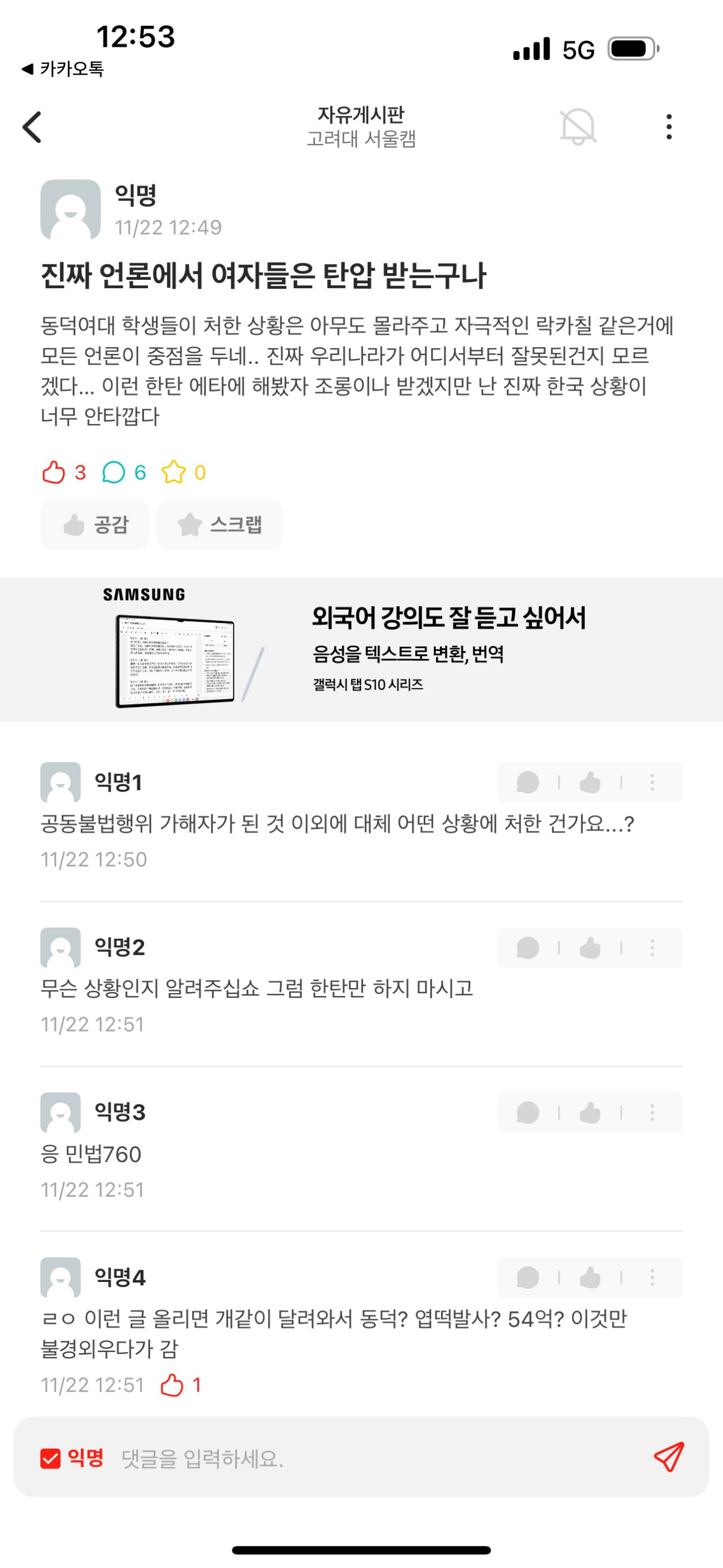 스산한 비바람이 들이치고 혹한이 드서리는 군대에서 20대 청춘을 바치고 살아가는 대한의 청년들은 반성하고 언론계의 여성탄압을 멈추기 위해서 연대(고대)해야되나?