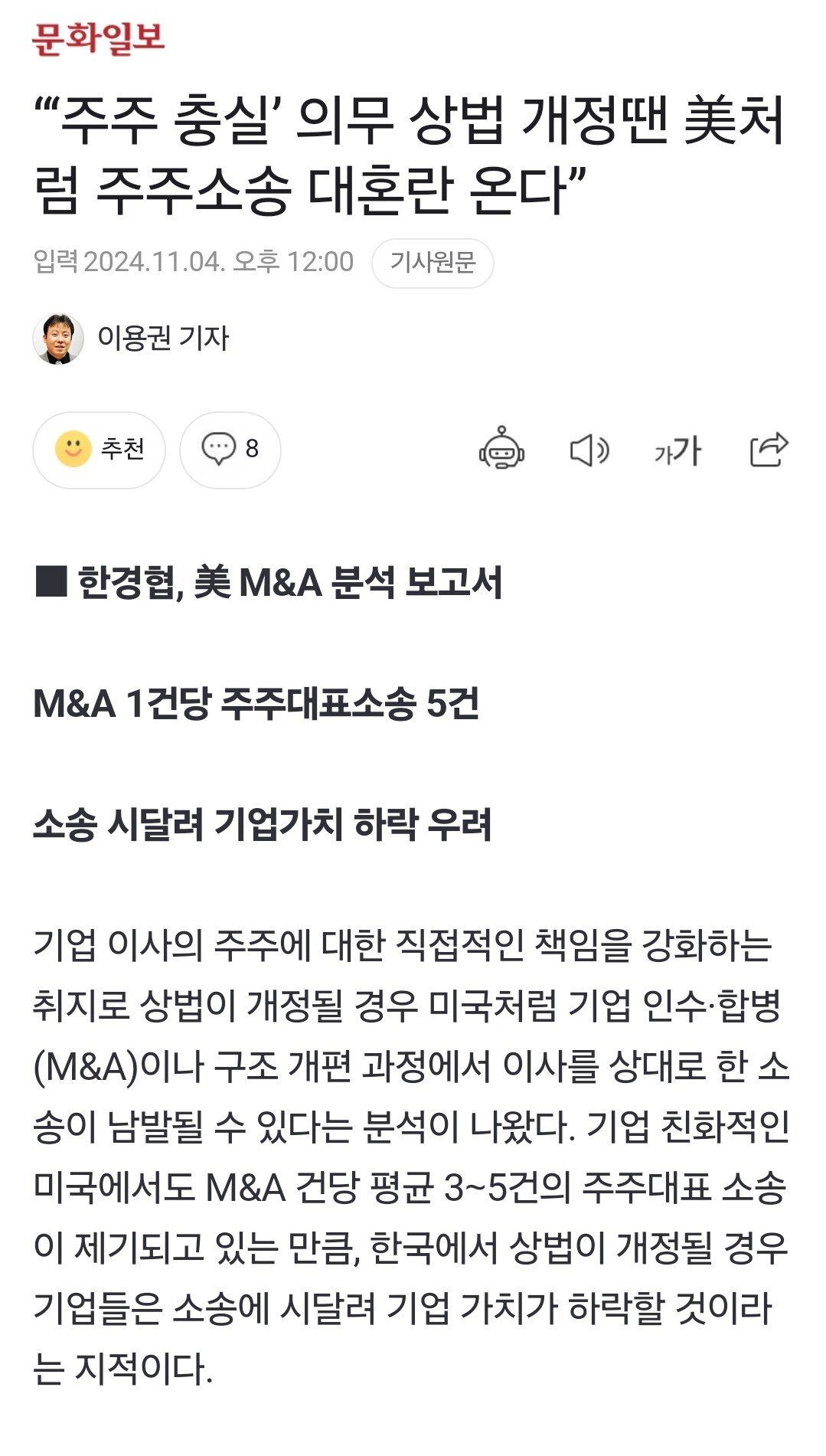 “‘주주 충실’ 의무 상법 개정땐 美처럼 주주소송 대혼란 온다”