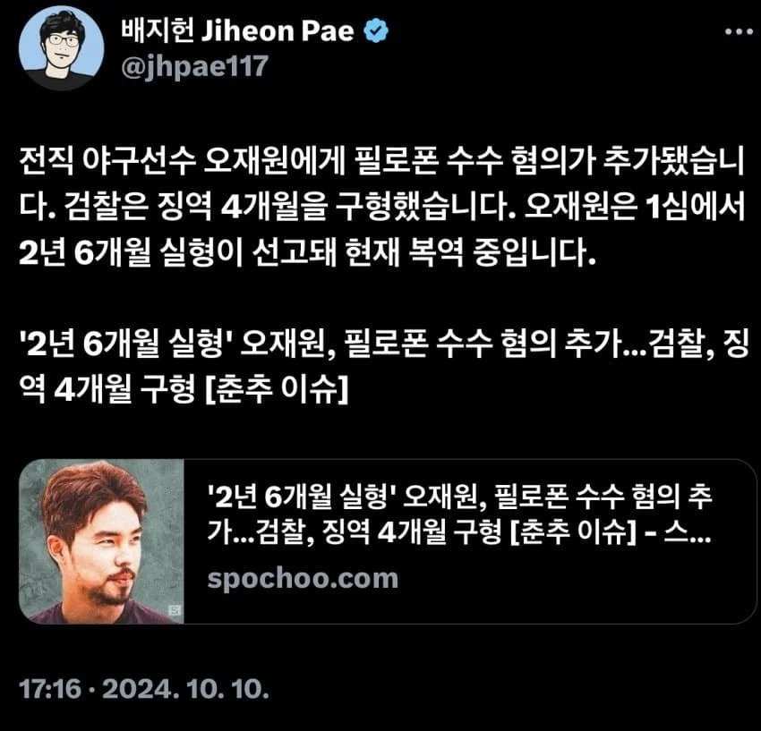 전직 야구선수 오재원... 마약 혐의 추가.