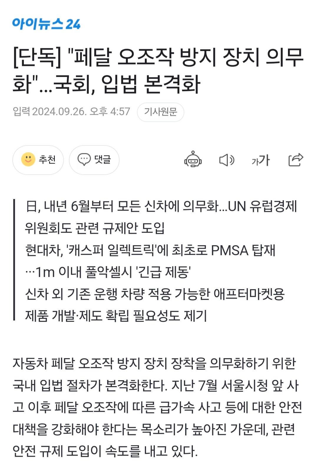 [단독] "페달 오조작 방지 장치 의무화"…국회, 입법 본격화