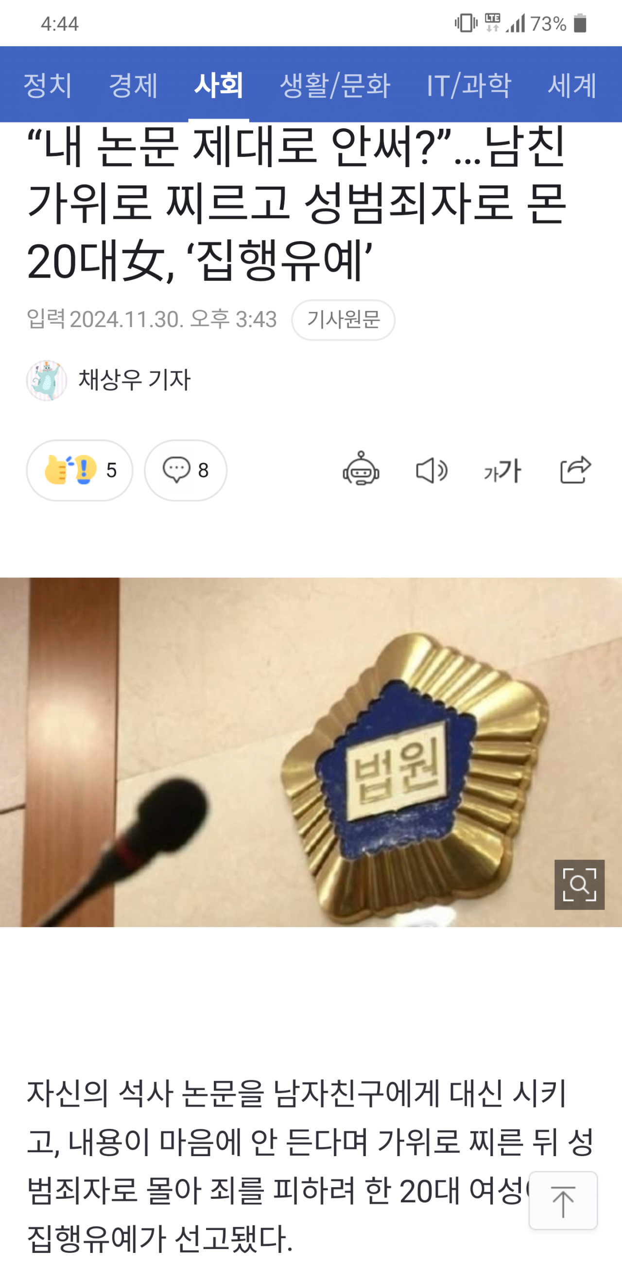 논문 제대로 안써? 남친 가위로 찌르고 성범죄자 몬 20대녀 집행유예
