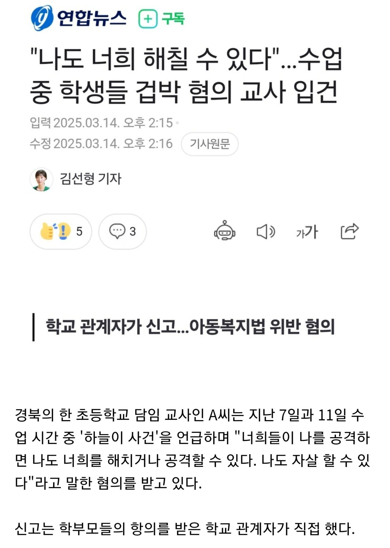 "나도 너희를 공격할수 있다" 초등교사 입건