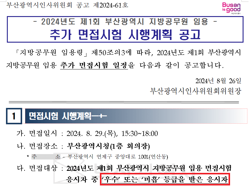 이렇듯 부산도 우수나 미흡 등급을 받은 응시자를 대상으로 재면접을 치러 모든 필기 합격자의 억울한 일이 최대한 안생기도록 하는 것을 알 수 있음.