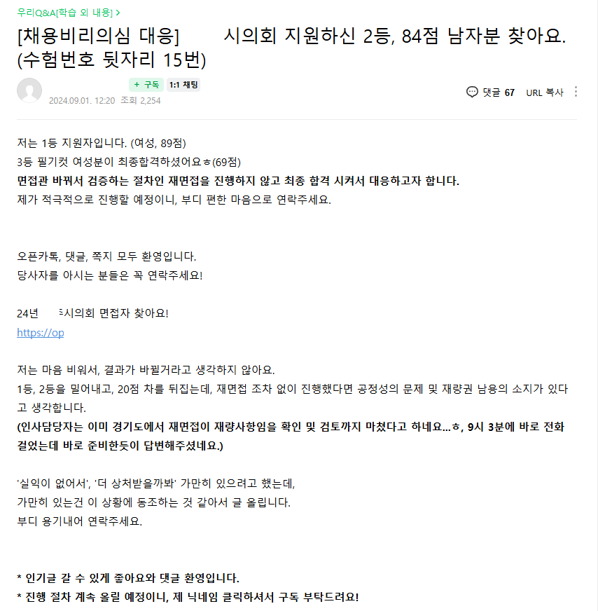 그리고 최종적으로 1명 뽑는데 89점, 84점 둘이 필기합격하고 면접보는건 몰라도, 굳이 69점까지 필기합격시킨것도 이해가 안감.