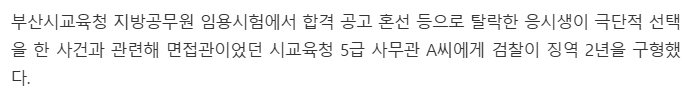 실제로 2020년도 부산광역시에서 똑같은 사례(필기1등 면접결과 보통, 필기2등 면접결과 우수로 필기2등이 최종합격, 필기1등은 탈락 후 극단적선택)가 있고, 진짜 비리였음이 밝혀진 사건이 있음.