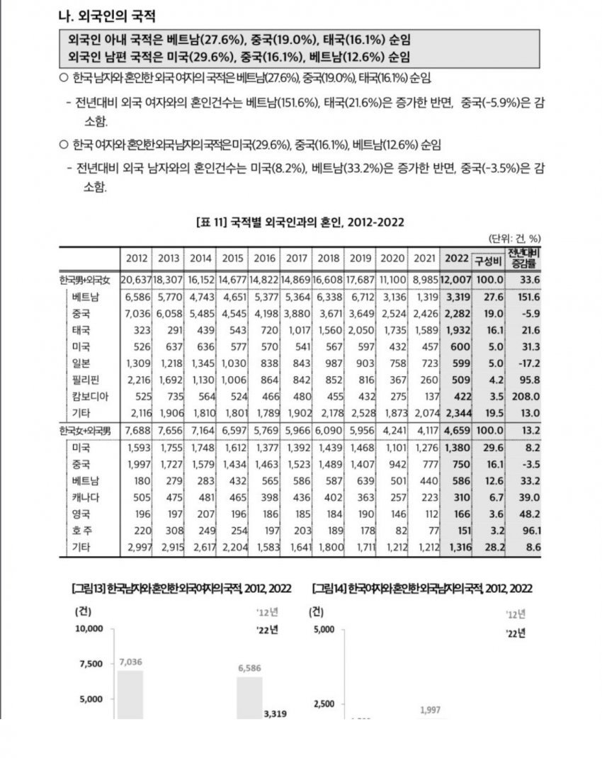 한국 남자 국결 추이는 2022년을 제외하고 꾸준히 증가하는 추세지만 백인여자 일본여자와 혼인 건수는 극소수..
