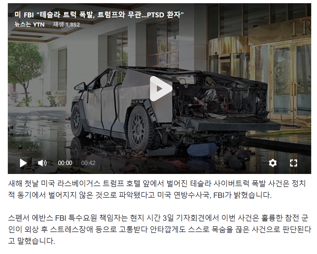 미 FBI "테슬라 트럭 폭발, 트럼프와 무관...PTSD 환자"