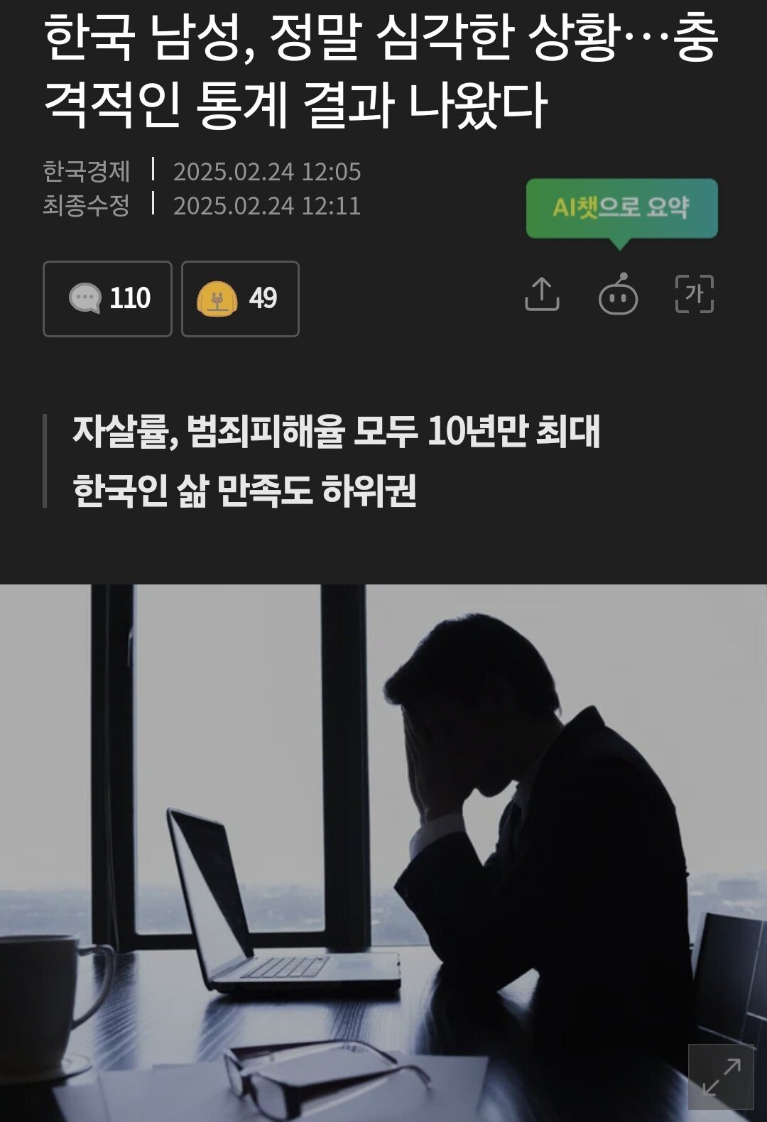 한국 남성 정말 심각한 상황 자살율 최대