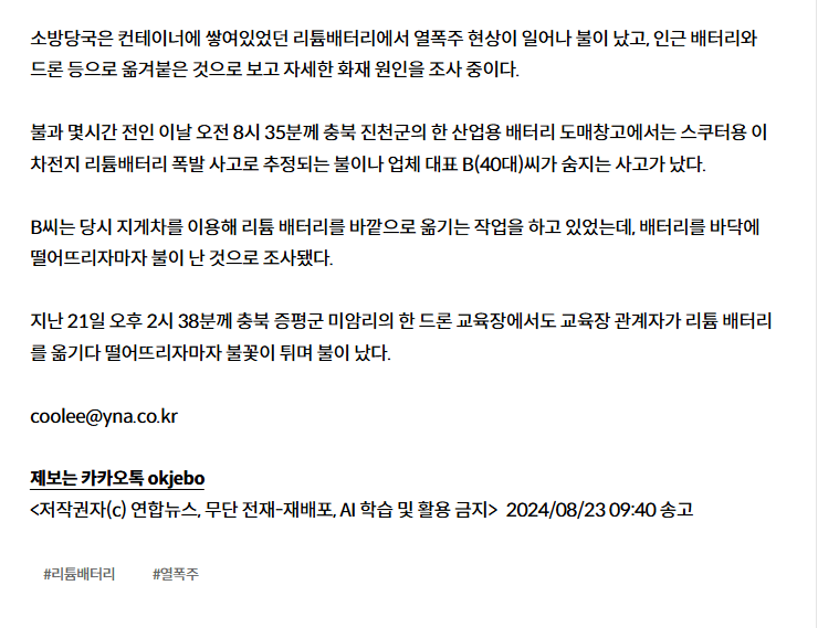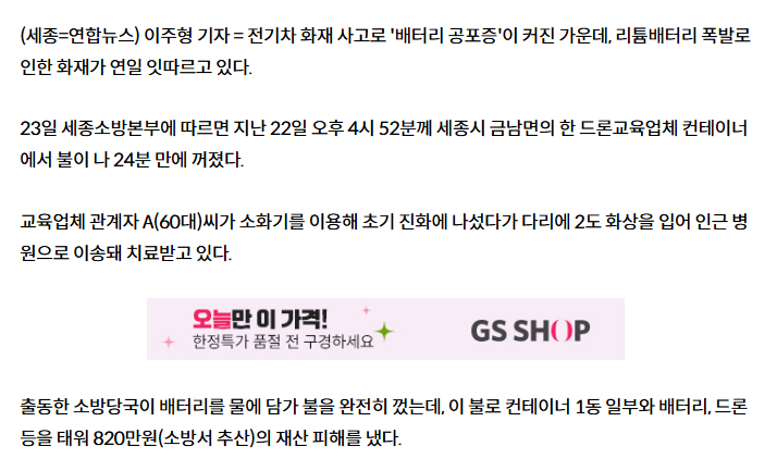 연일 배터리 화재...세종 드론교육장서도 리튬배터리 폭발