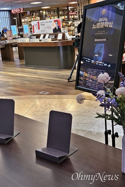 ▲ 한강 작가의 노벨문학상 수상 다음날인 11일 오전 9시 30분께, 막 문을 연 서울 종로구 교보문고 광화문점의 특별매대의 책이 모두 팔렸다.ⓒ 박수림