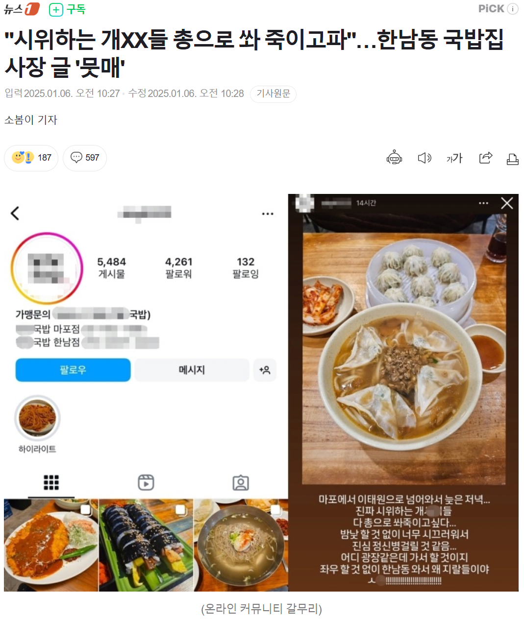 서울 용산구 한남동과 마포구 도화동에서 국밥집을 운영하는 A 씨는 이날 가게 공식 SNS 계정에 이 같은 게시물을 올렸다.