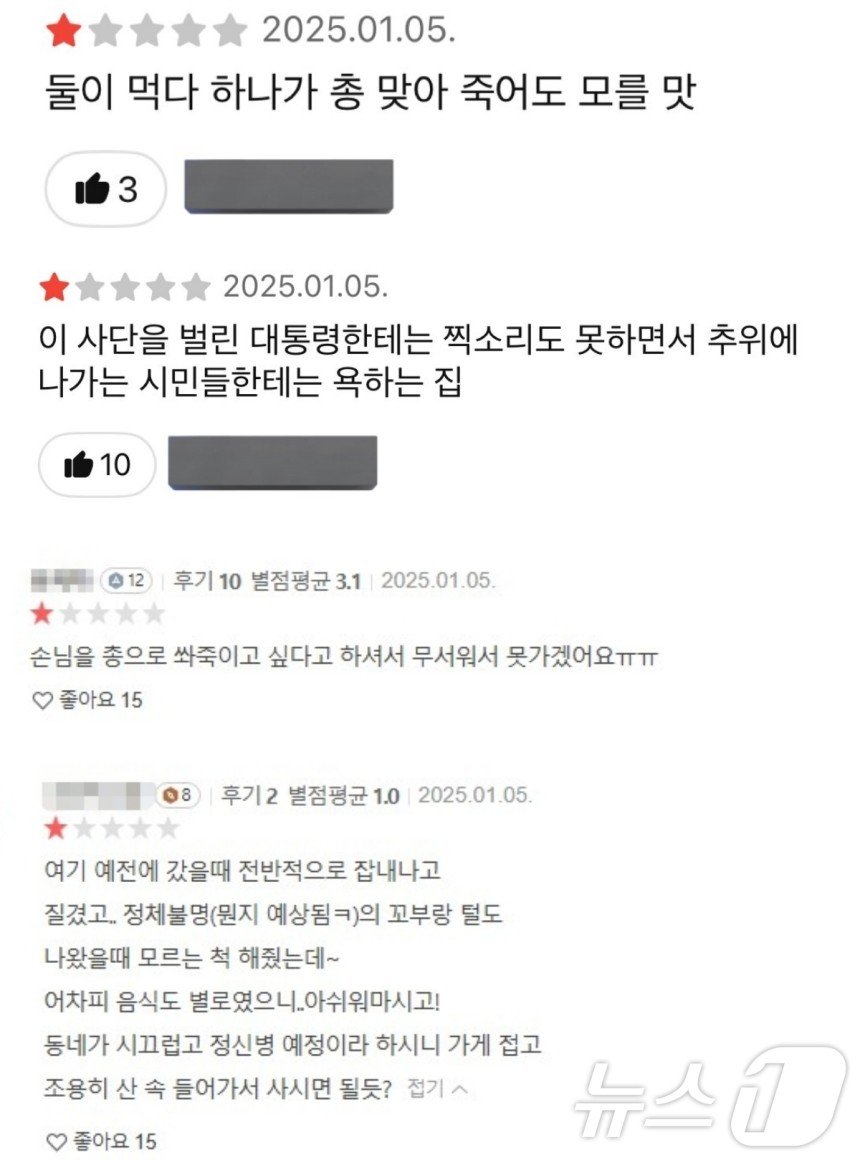 A 씨의 게시물은 갈무리돼 SNS로 퍼졌고 카카오맵 가게 리뷰에는 별점 1점 테러가 이어졌다.