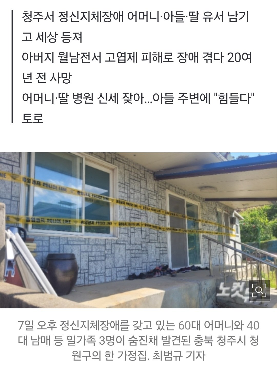 고엽제 피해로 장애를 갖게 된 일가족 3명이 숨진 채 발견돼 주위의 안타까움을 사고 있다.