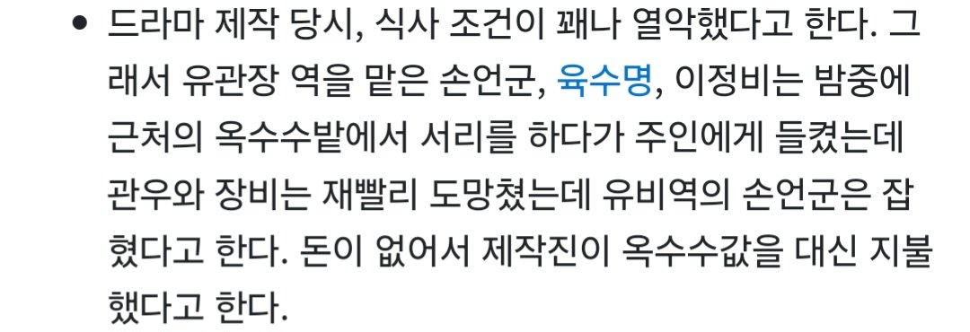 유비 장비 관우 배우가 옥수수 밭에서 배고파서 옥수수 훔쳐먹다가 들켰고