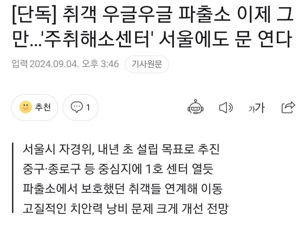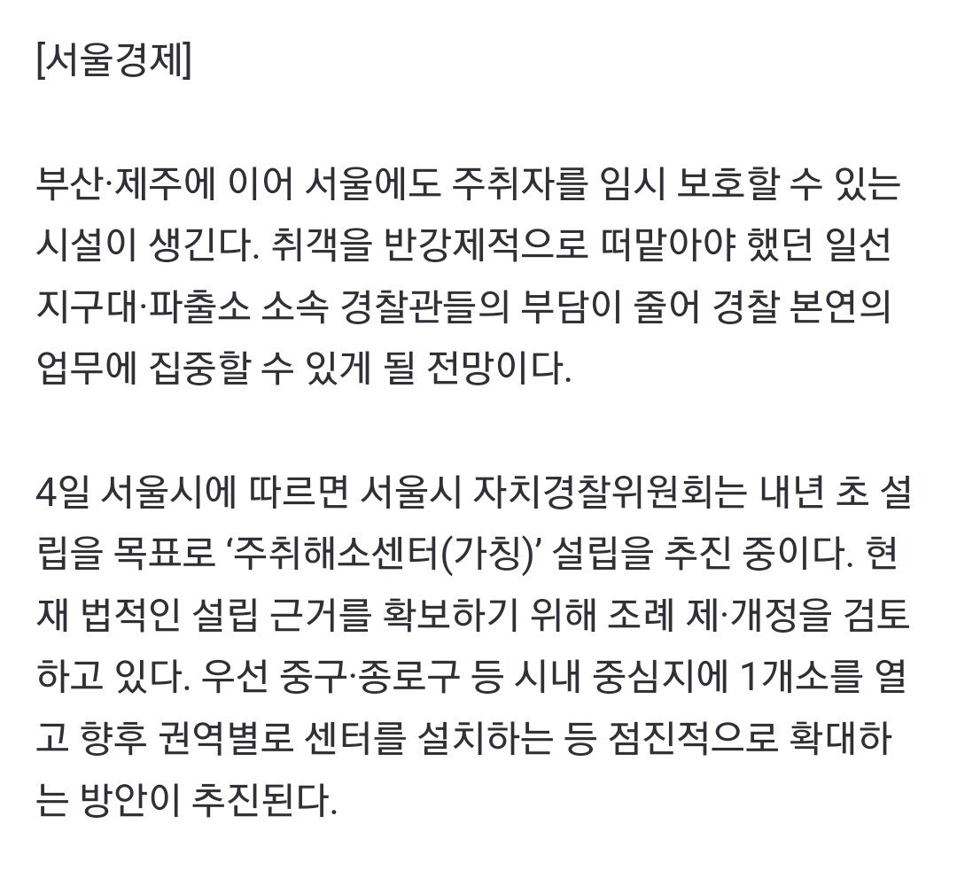 [단독] 취객 우글우글 파출소 이제 그만…'주취해소센터' 서울에도 문 연다