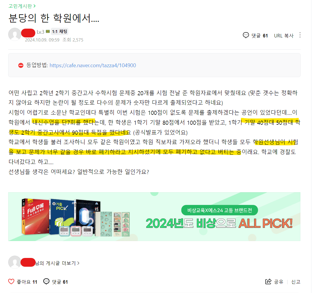 분당 한 학원에서 모 학교 내신 수학시험 유출 의심